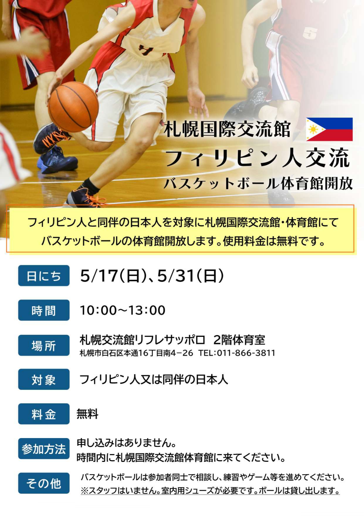 5月 フィリピン人交流 バスケットボール体育館開放